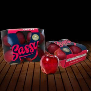Tapa de fruta Linerless y bandeja de cartón para packs de 4 manzanas.